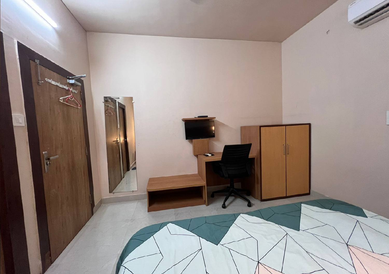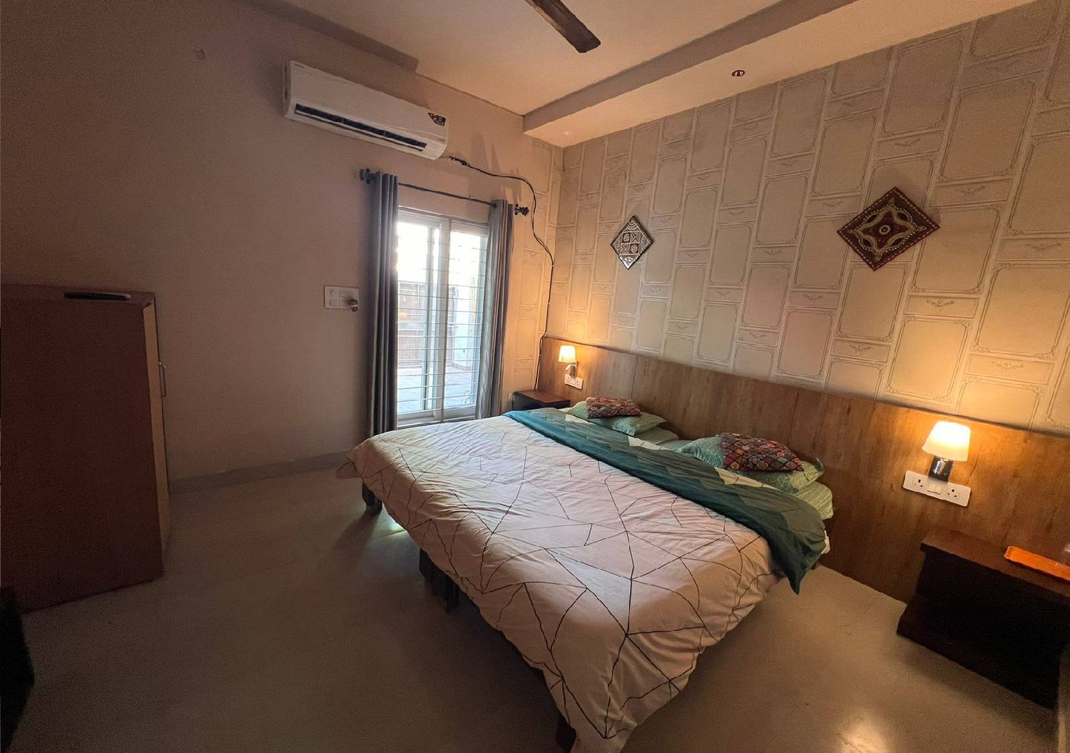 Spacious and elegantly designed, the King Size Double Bed Room offers a perfect blend of comfort and convenience. Featuring a plush king-size bed, modern furnishings, and soothing interiors, this room is ideal for couples or small families. Enjoy a relaxing stay with essential amenities, ample natural light, and a peaceful ambiance that ensures a restful night and a pleasant experience throughout your stay.